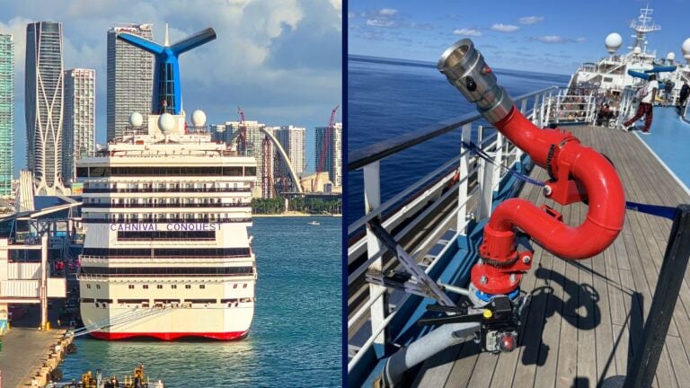 [[{“value”:”Carnival Conquest has a new funnel fire suppression system that will be better equipped to tackle high-reaching flames in an emergency.